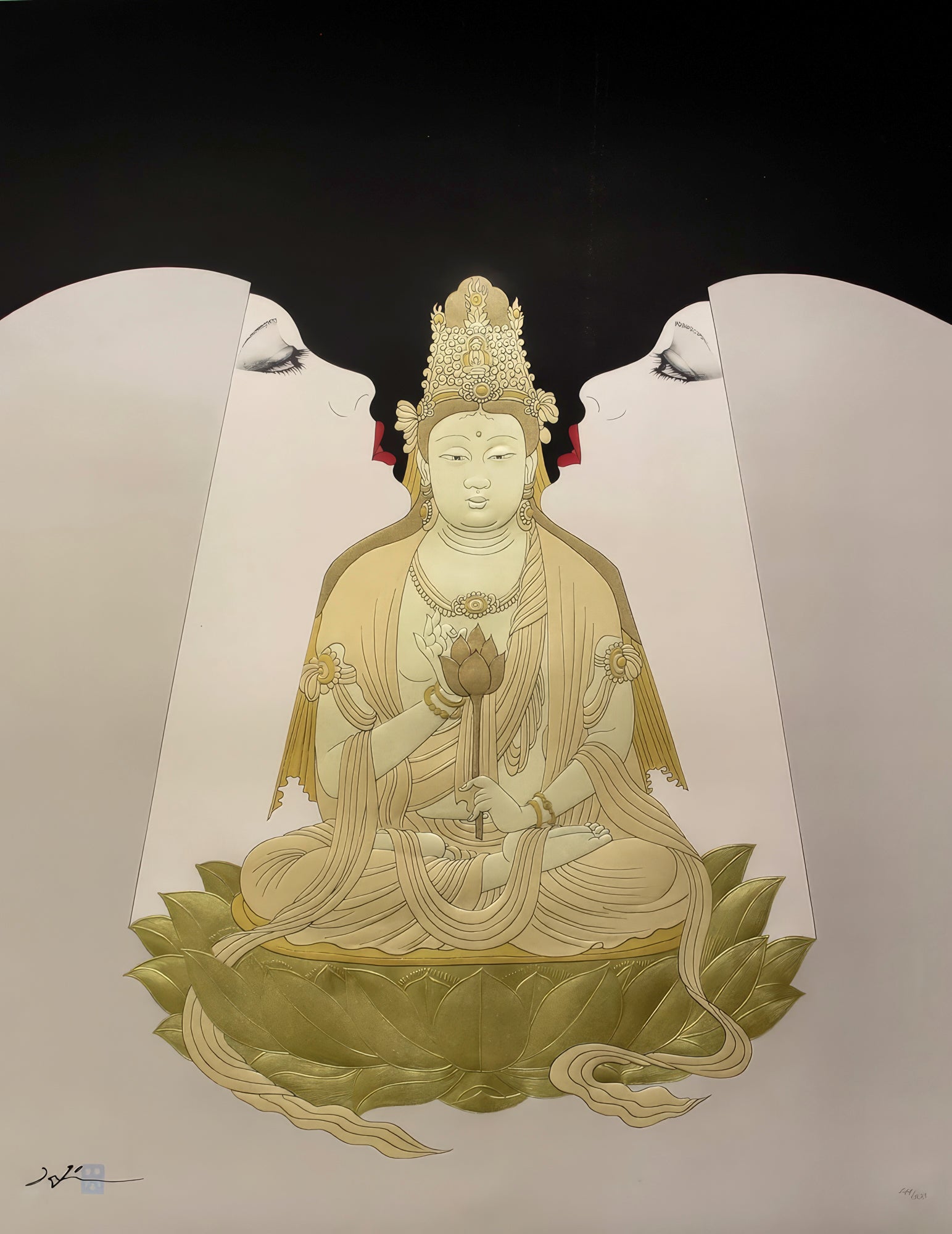 Created during Otsuka’s post-Hawaii period, Harmony reflects his evolving mission to merge classical Japanese aesthetics with modern Western influences. Through Lady Mieko and the subtle presence of Kannon, the artwork conveys a message of cultural coexistence, balance, and inner peace.
