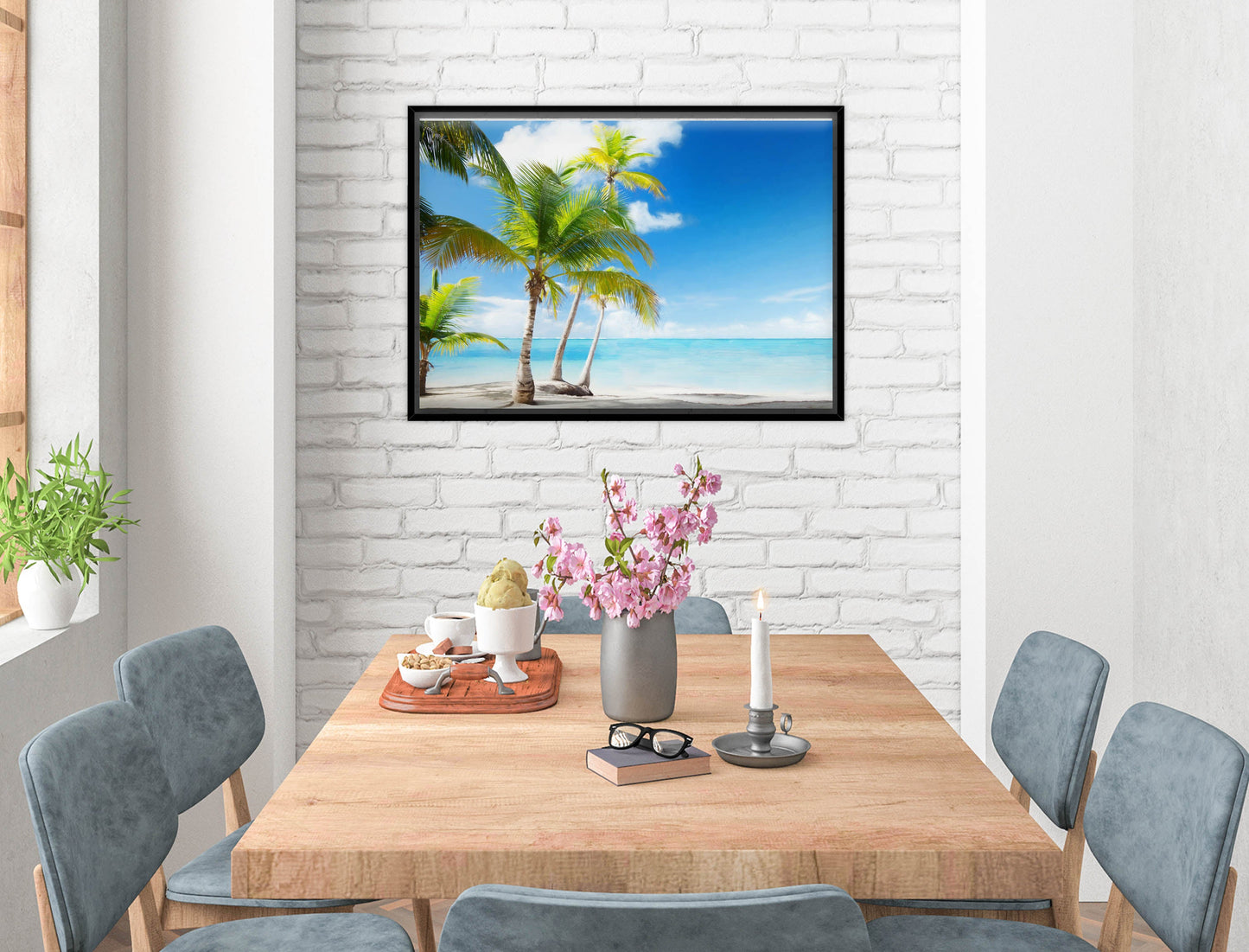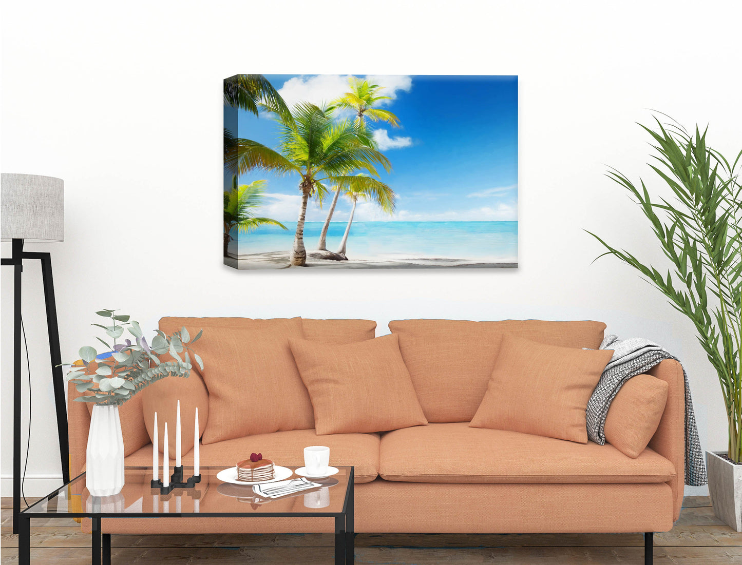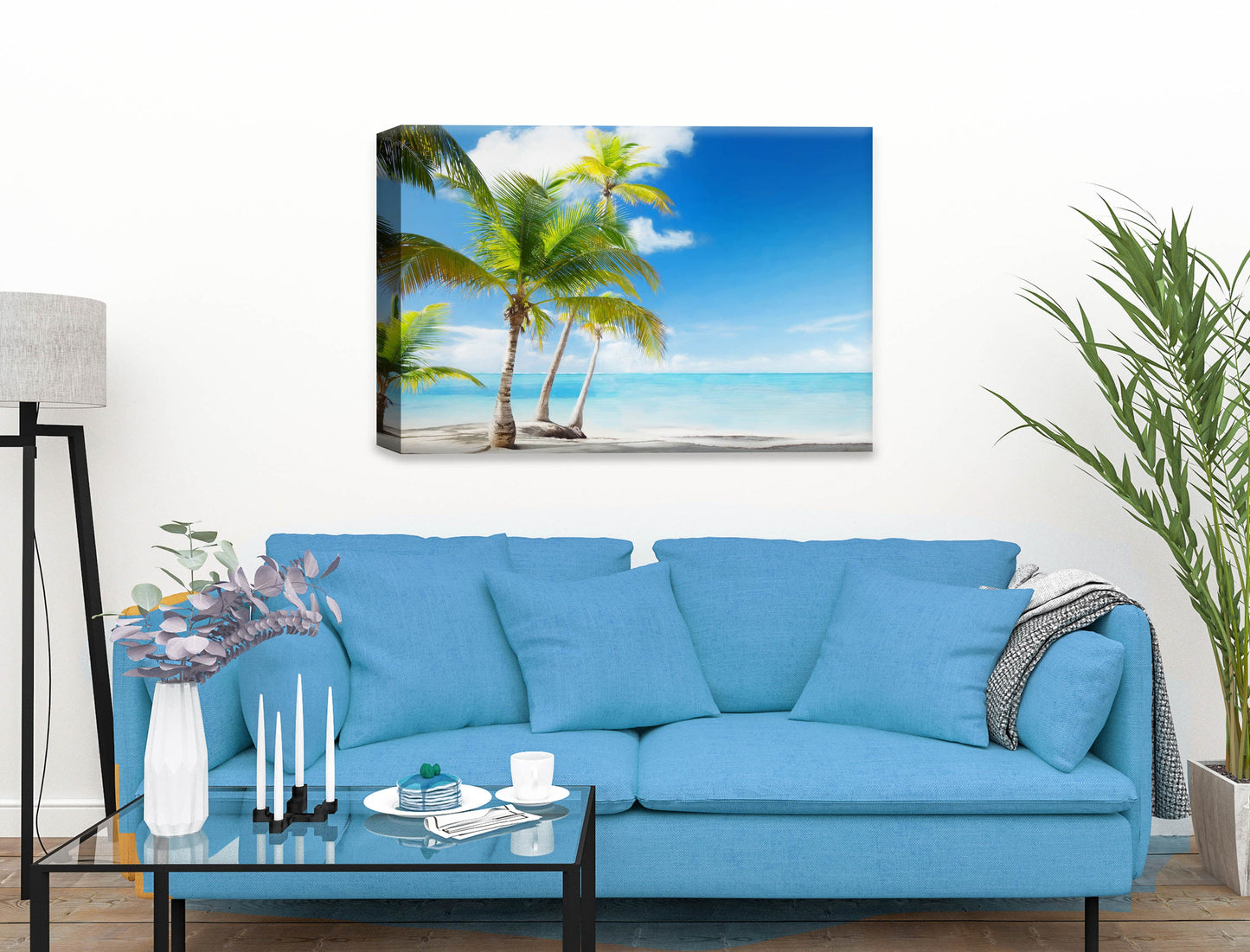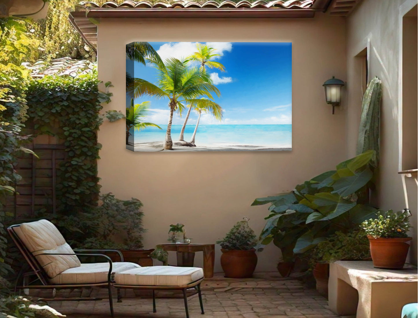 Bring a touch of the tropics to your home with this sophisticated canvas print of a beach and palm trees gently lapping the ocean. With its stunning puffy skies, it's a perfect addition to any indoor or outdoor space and is sure to bring a sense of serenity and tranquility.