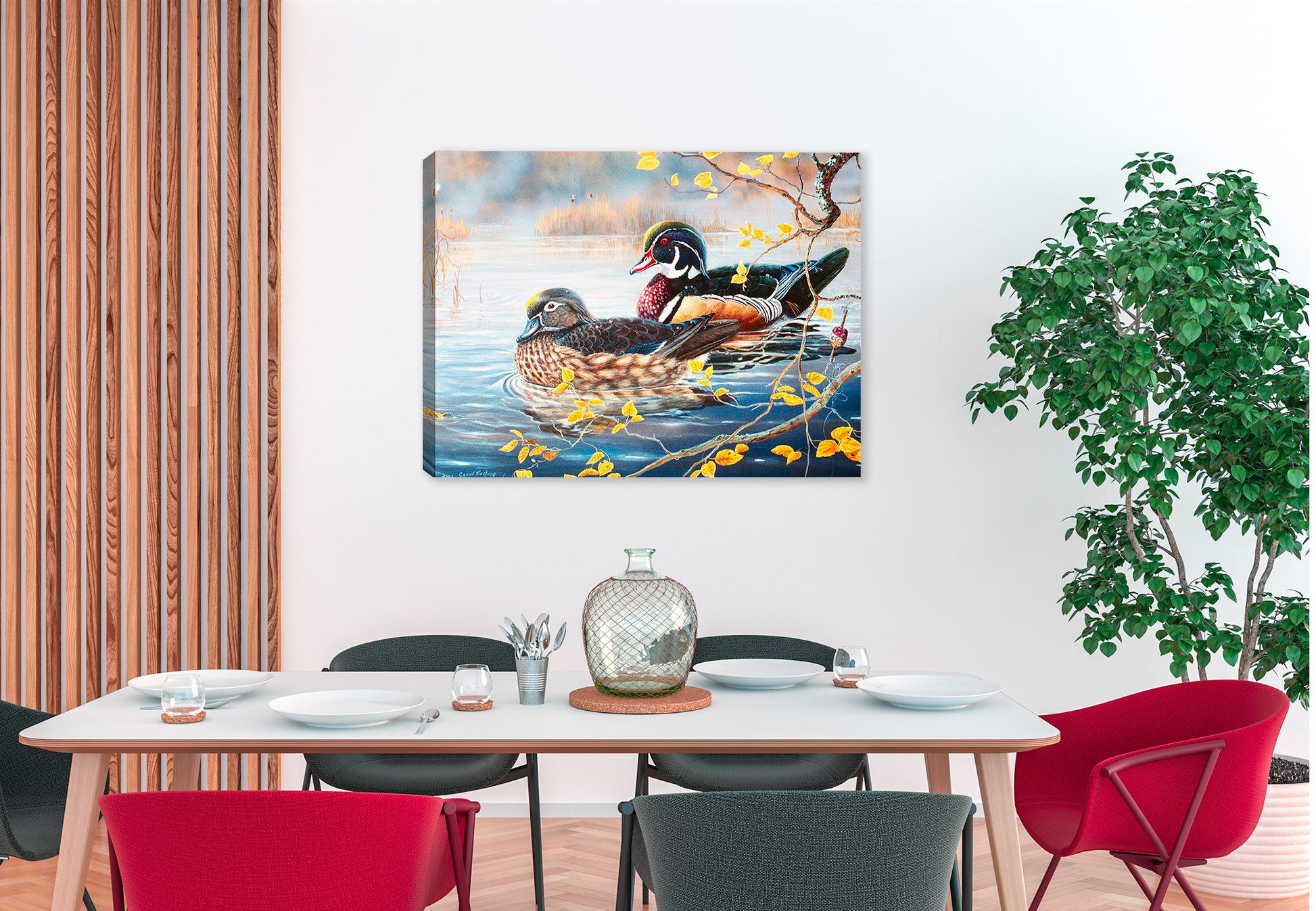 Indulge in the exquisite artwork of Carol Decker with this stunning painting, showcasing a serene scene of a Wood Duck and Bobber on a crisp autumn day. With vibrant colors and intricate details, this piece will bring a touch of elegance and nature to any space.