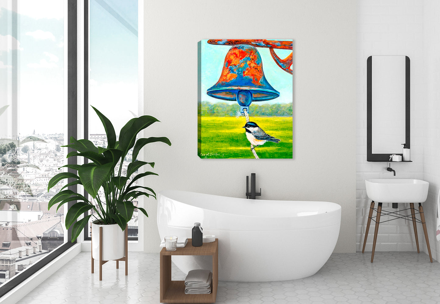 Bring the beauty of nature to your home with our Dinner Bell with Bird painting. This stunning canvas features a charming bird under a rustic dinner bell in a lush green field. Add a touch of elegance and tranquility to any room with this unique piece of art.