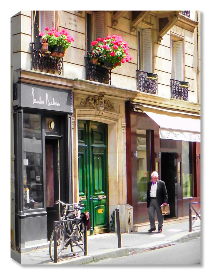 Experience the charm of Paris with Heading Home. This stunning photograph captures an older gentleman strolling down the streets, surrounded by quaint shops and a parked bicycle. Showcasing the artistry of Mindy Schroeder, this piece adds sophistication and worldly elegance to any space.