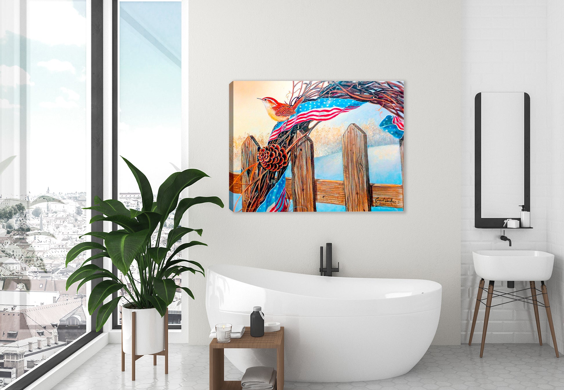 Featuring a breathtaking display of American pride, the Old Glory - Morning artwork by Carol Decker showcases the iconic stars and stripes wrapped around a rustic fence, adorned with a charming wreath and perched bird. A beautiful addition to any space, this piece celebrates the beauty and spirit of the USA.