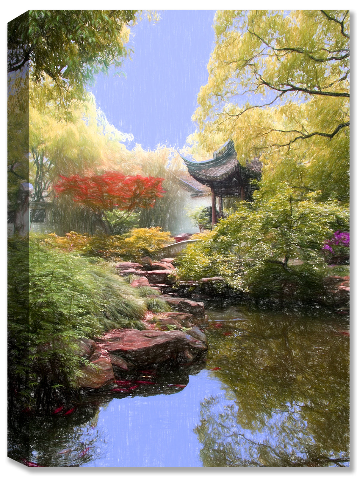 Indulge in the serene beauty of Japan with The Monastery Garden. This fine art painting on canvas perfectly captures the essence of a Japanese garden with its clear water, rocks, greenery, and contrasting colors. Bring a piece of Japan into your home and feel the peaceful energy every day!