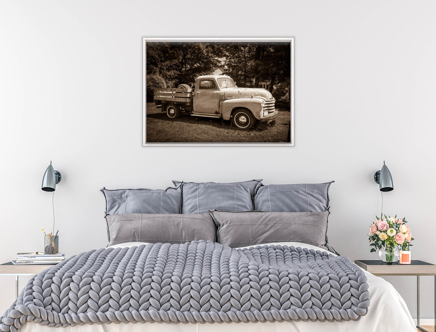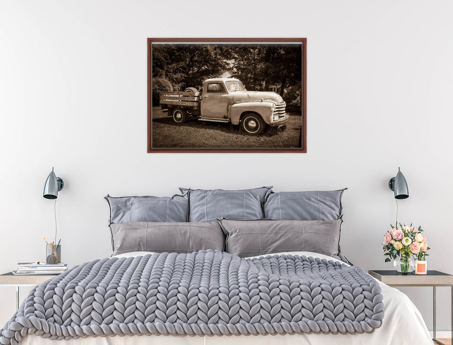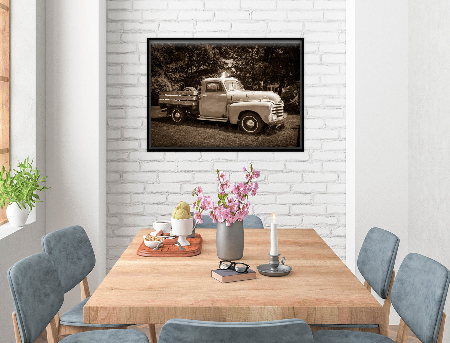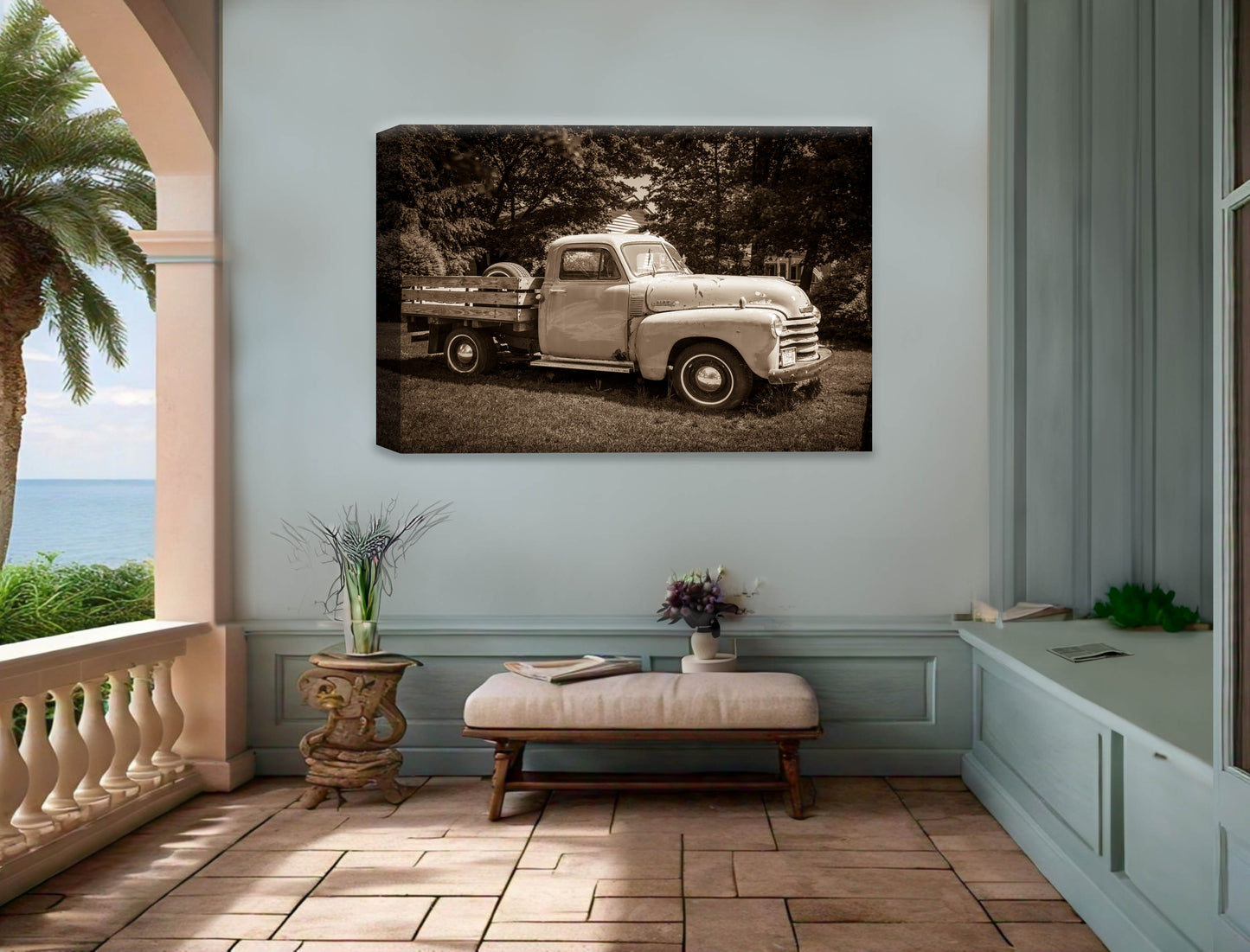 Take a journey through time with our Vintage Pickup Truck photograph by famed photographer, Ray Huffman. The sepia tone adds a touch of nostalgia, making it perfect for any room. Available in canvas wrap or framed, it's a unique piece of fine art that will inspire and delight. About the truck: The 3100 Chevrolet pickup truck, manufactured from 1947 to 1955, is celebrated for its iconic rounded design and cultural significance. It offered reliable performance with engine options including a 216 and 235-cubic-inch inline-six. Available in various body styles, it served diverse purposes from farm work to urban commuting. Its enduring appeal has made it popular for restoration and customization, fetching high prices among collectors as a symbol of American automotive history.