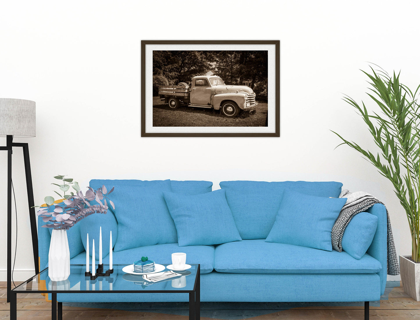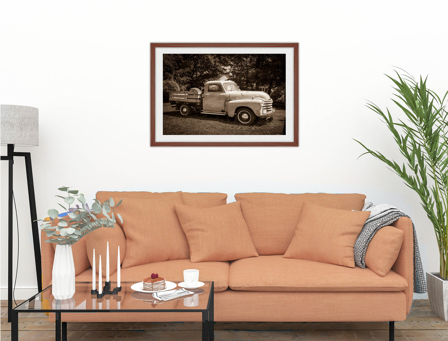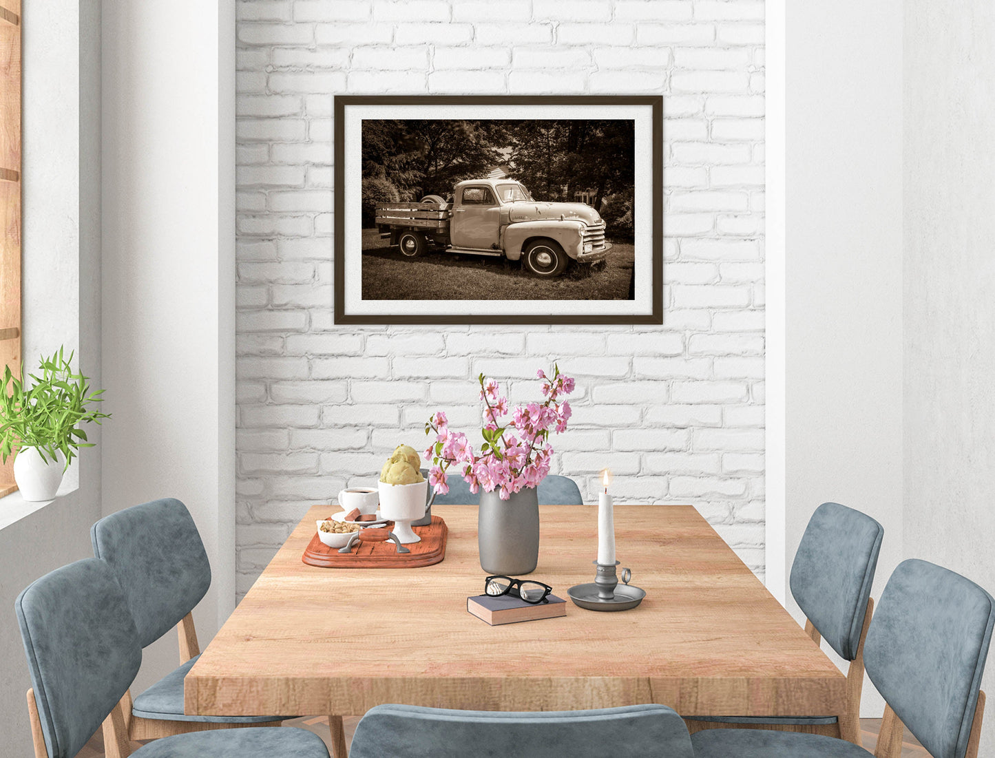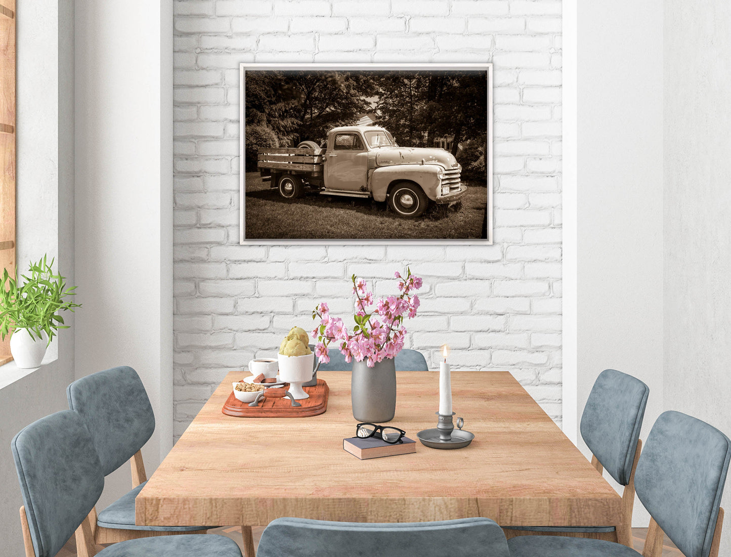 Take a journey through time with our Vintage Pickup Truck photograph by famed photographer, Ray Huffman. The sepia tone adds a touch of nostalgia, making it perfect for any room. Available in canvas wrap or framed, it's a unique piece of fine art that will inspire and delight. About the truck: The 3100 Chevrolet pickup truck, manufactured from 1947 to 1955, is celebrated for its iconic rounded design and cultural significance. It offered reliable performance with engine options including a 216 and 235-cubic-inch inline-six. Available in various body styles, it served diverse purposes from farm work to urban commuting. Its enduring appeal has made it popular for restoration and customization, fetching high prices among collectors as a symbol of American automotive history.