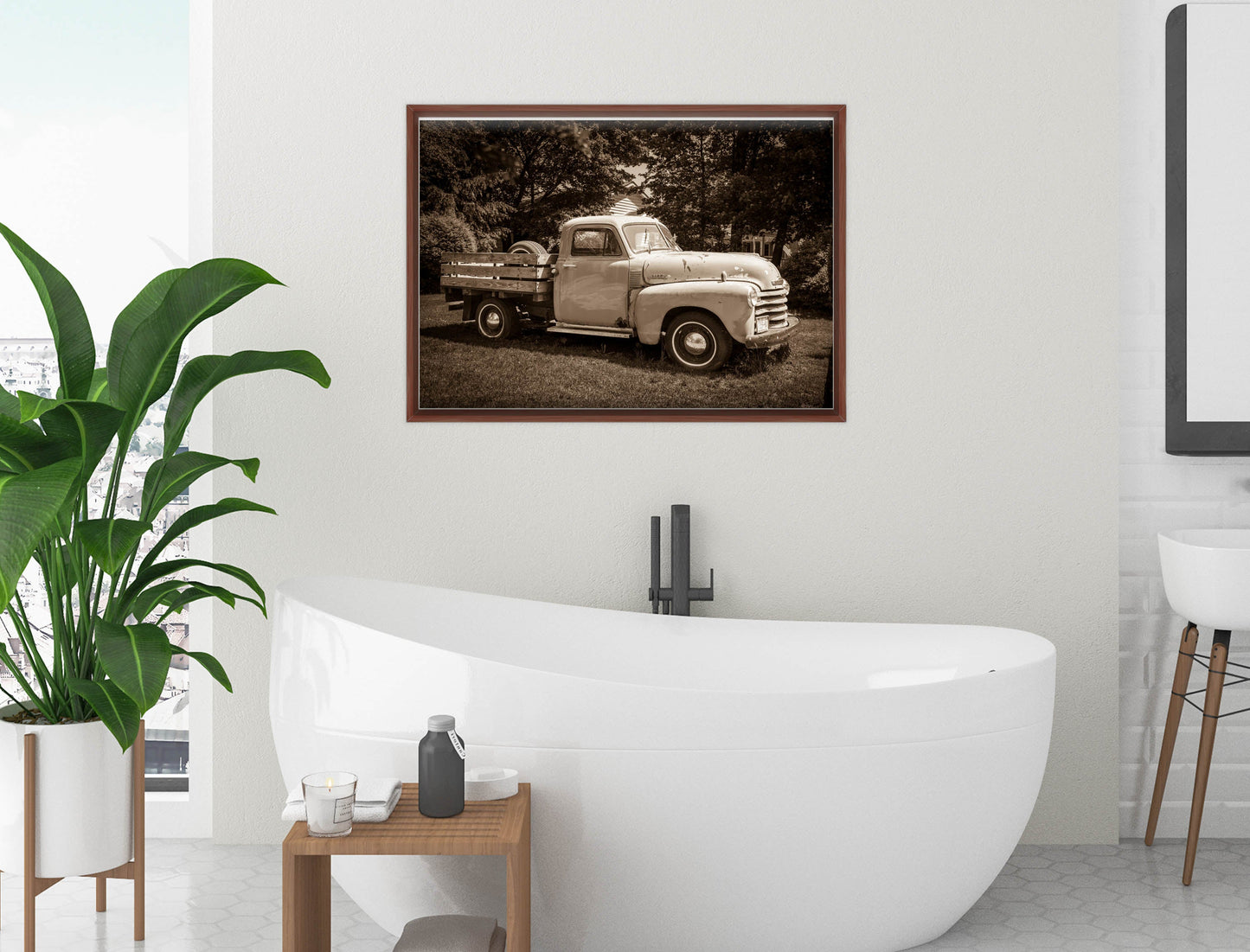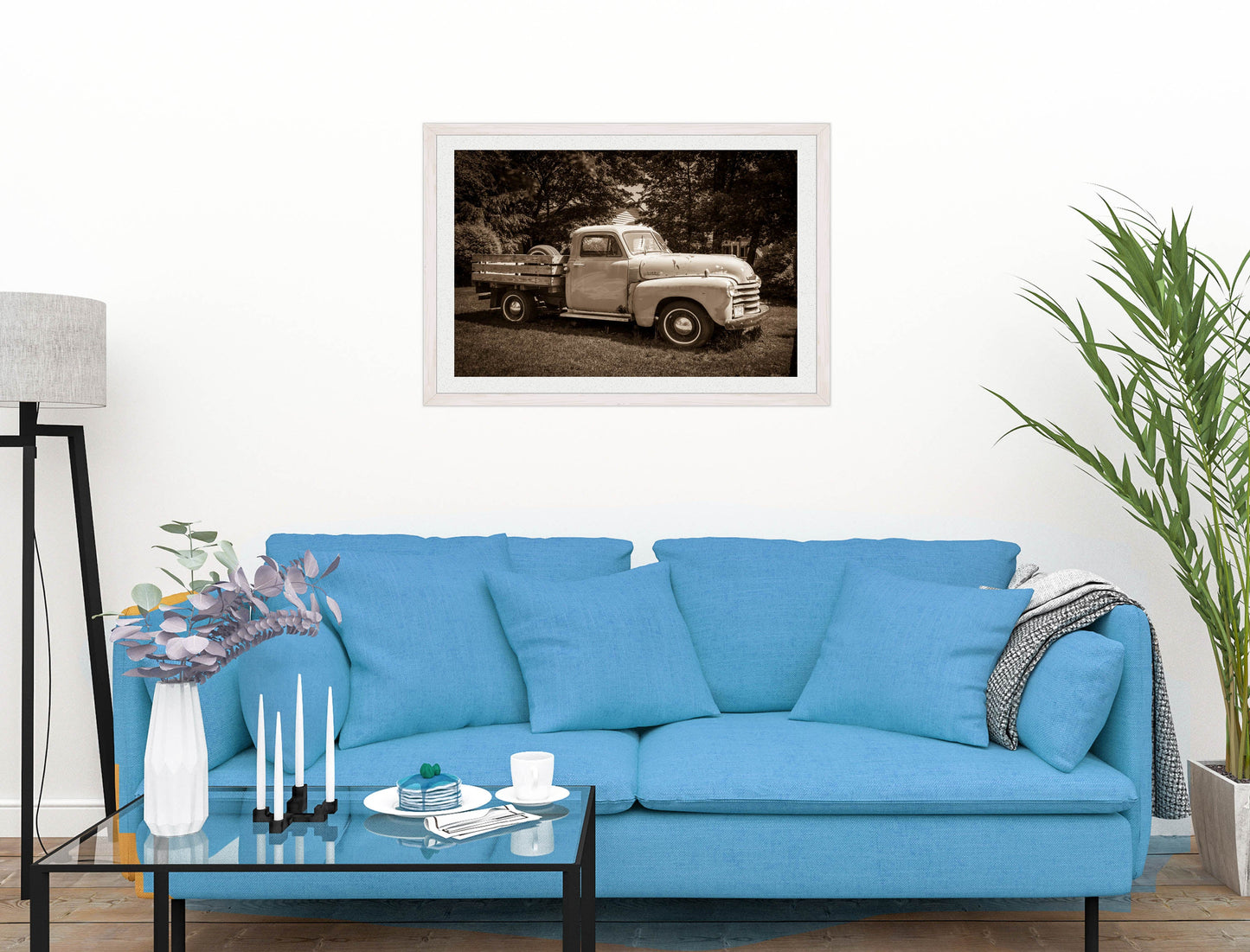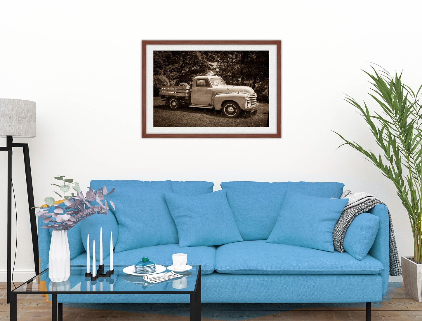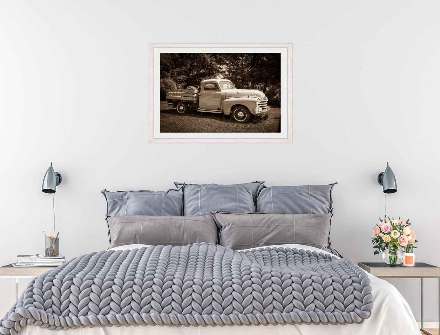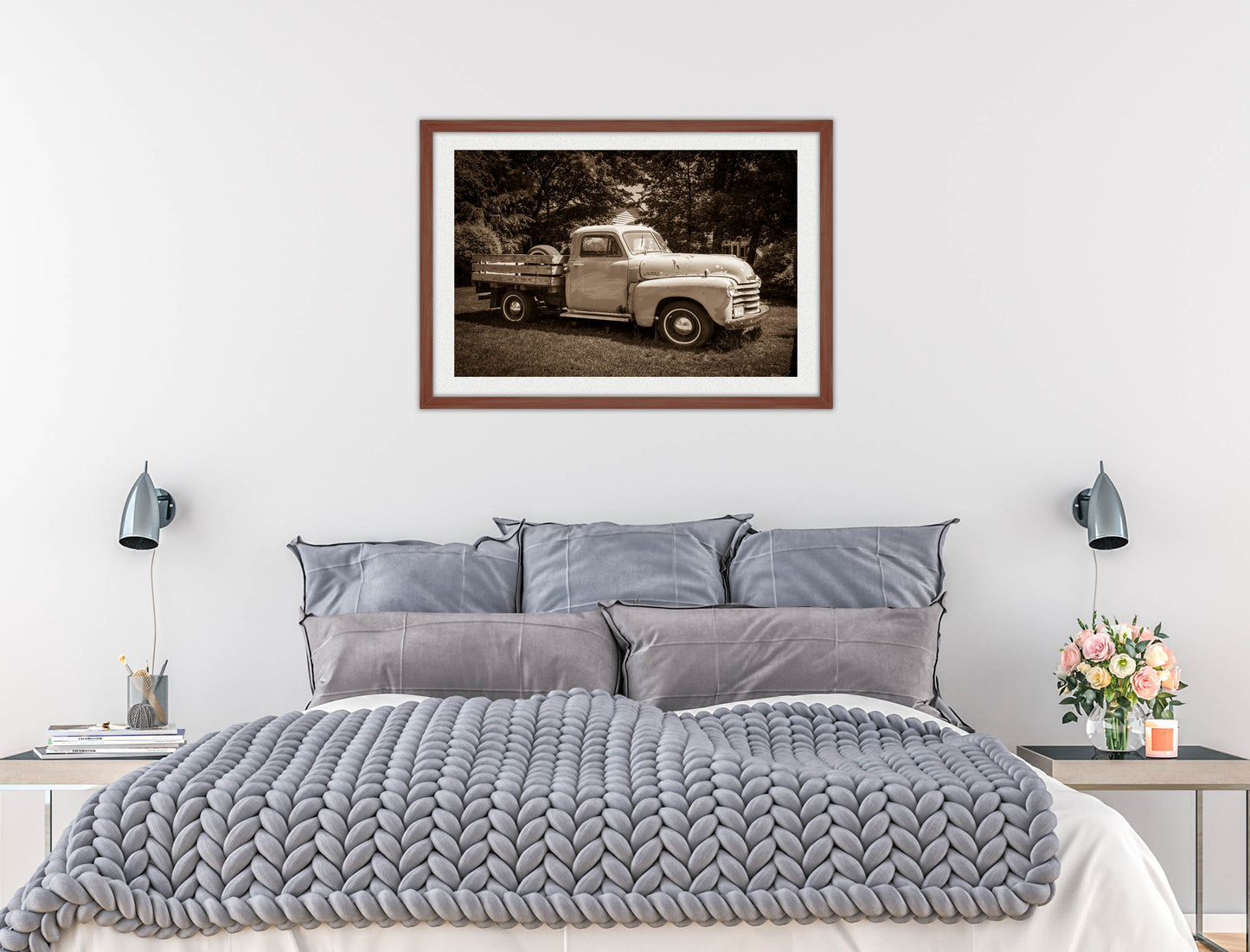 Take a journey through time with our Vintage Pickup Truck photograph by famed photographer, Ray Huffman. The sepia tone adds a touch of nostalgia, making it perfect for any room. Available in canvas wrap or framed, it's a unique piece of fine art that will inspire and delight. About the truck: The 3100 Chevrolet pickup truck, manufactured from 1947 to 1955, is celebrated for its iconic rounded design and cultural significance. It offered reliable performance with engine options including a 216 and 235-cubic-inch inline-six. Available in various body styles, it served diverse purposes from farm work to urban commuting. Its enduring appeal has made it popular for restoration and customization, fetching high prices among collectors as a symbol of American automotive history.